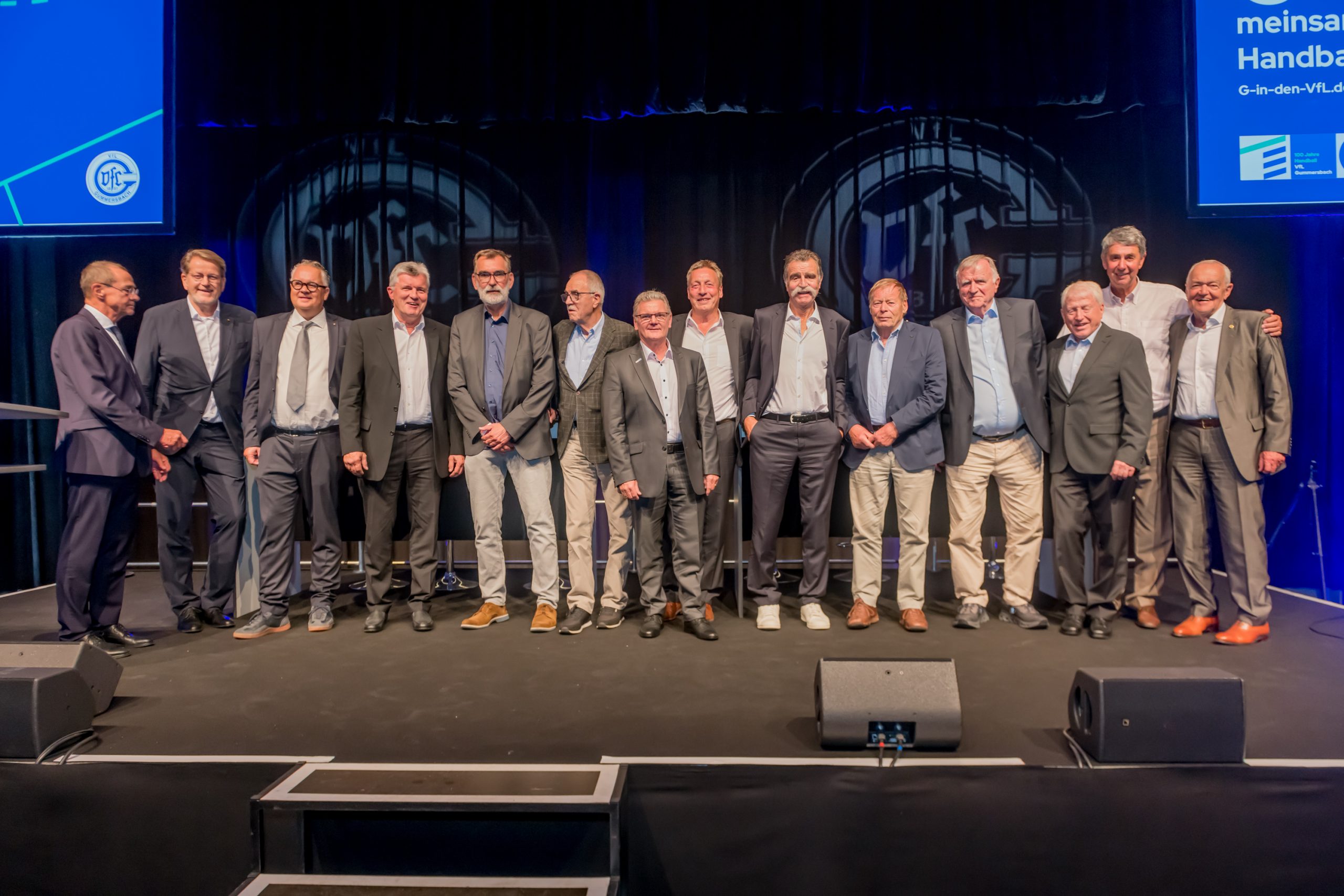 Auf und vor der Bühne trafen Generationen aufeinander: Heiner, Klaus und Jochen Brand, Andreas Thiel, Klaus Alberts, Klaus Schlagheck, Klaus Kater, Thomas Krokowski sowie fast die komplette Meistermannschaft von 1991. Jo Deckarm konnte nach überstandener Lungenentzündung nicht kommen; Rune Erland schickte nach gestrichenem Flug einen Videogruß. Weitere Videobotschaften kamen u. a. von Kyung-Shin Yoon, Francois-Xavier Houlet, Markus Hütt, Paul Drux, Patrick Wienzcek, Bennet Wiegert und Stefan Kretzschmar. Auch HBL-Geschäftsführer Frank Bohmann meldete sich per Video und zeigte sich überzeugt, dass der VfL „schon bald wieder um die Deutsche Meisterschaft mitspielen“ wird.